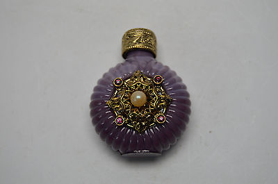Vtg Czech perfume bottle violet opaque glass pink stones faux pearl glass dauber