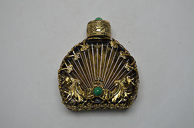 Vtg Czech filigree perfume bottle smoke glass green stones , glass dauber