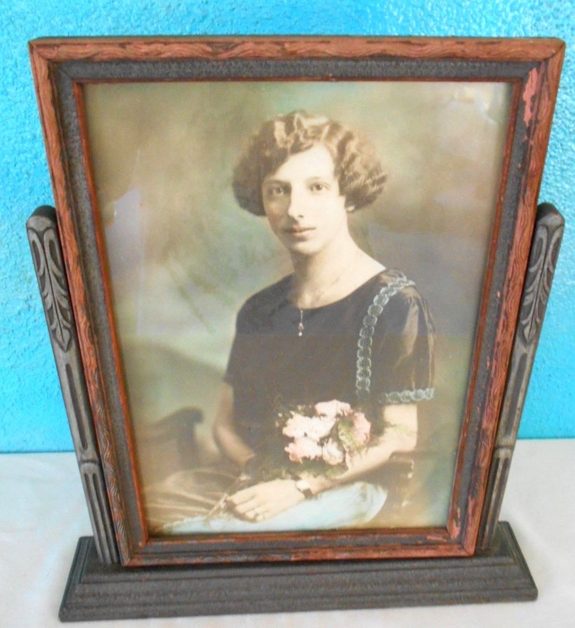 Title (ebay affiliate link): VINTAGE 1930s-40s STAND-UP WOODEN PICTURE FRAME w/DESIGN & PICTURE SIZE: 7 X 10