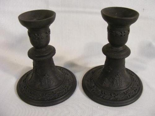 PAIR VINTAGE LORD WEDGWOOD BLACK BASALT CLASSICAL CANDLESTICKS