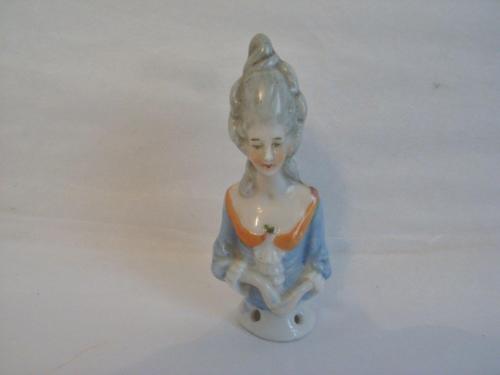 SUPERB ANTIQUE PORCELAIN HALF DOLL SEWING PIN CUSHION REGENCY LADY GERMAN? h