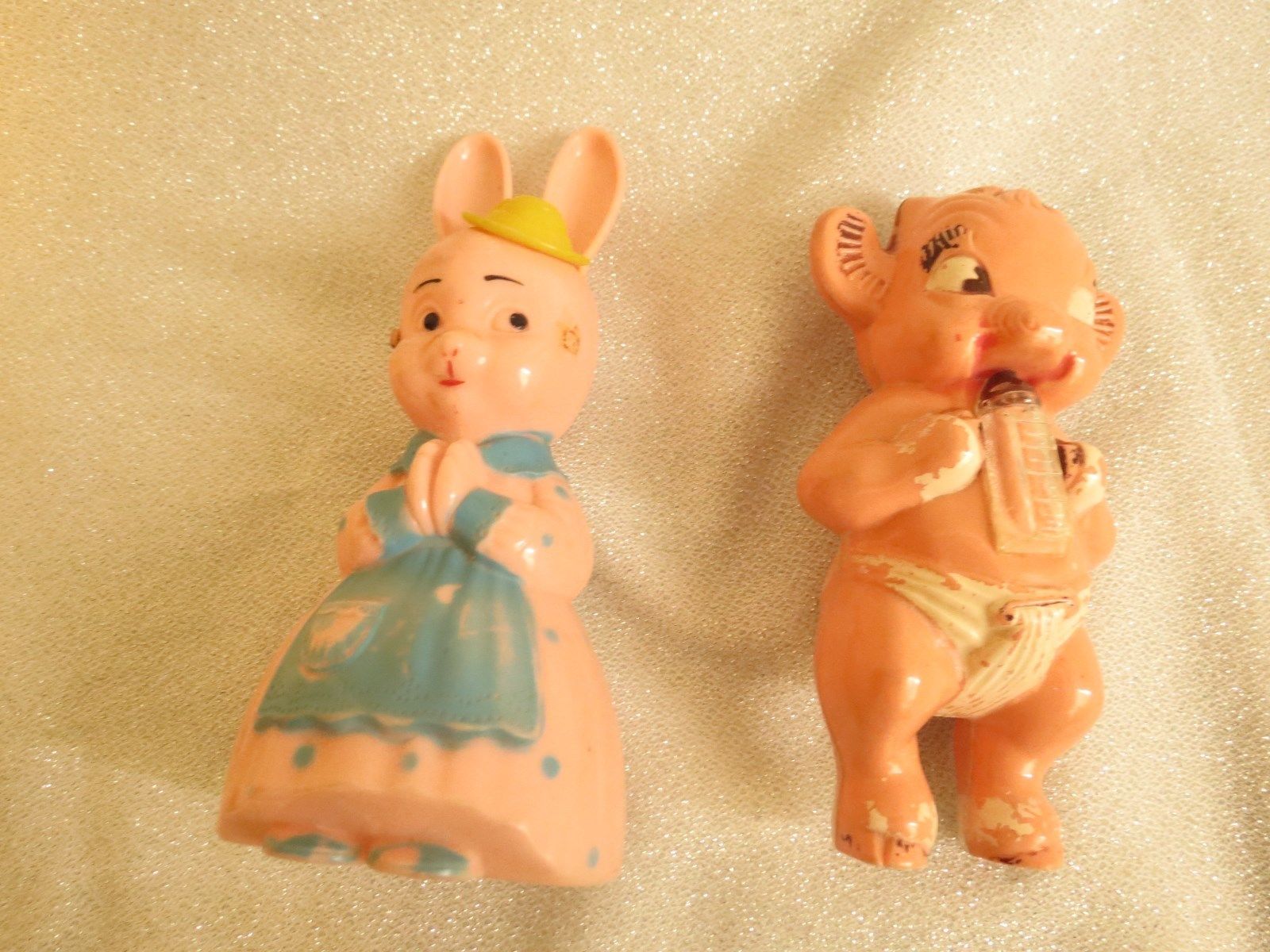 Title (ebay affiliate link): Vintage Knickerbocker Hard Plastic BUNNY RABBIT RATTLE & Borden Cow