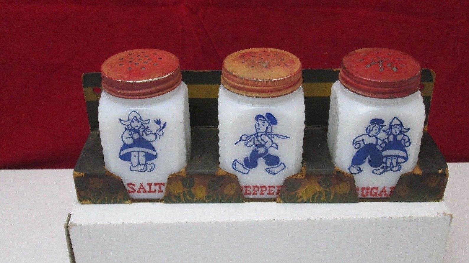 Title (ebay affiliate link): Vintage Milk Glass 3 Pc Range Set Salt Pepper Sugar Dutch W/ Cardboard Shelf