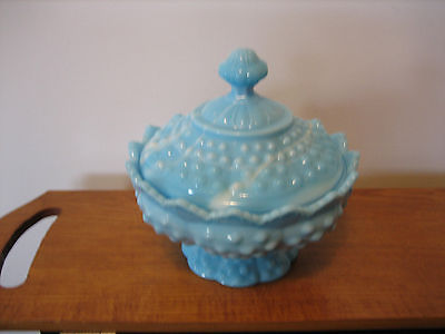 Title (ebay affiliate link): Vintage Fenton Glass Pastel Blue Milk Glass Hobnail Compote Candy Dish with Lid