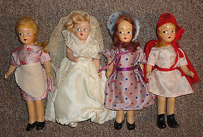 4 Charming Antique 8" Hand Painted Paper Mache Girl Dolls