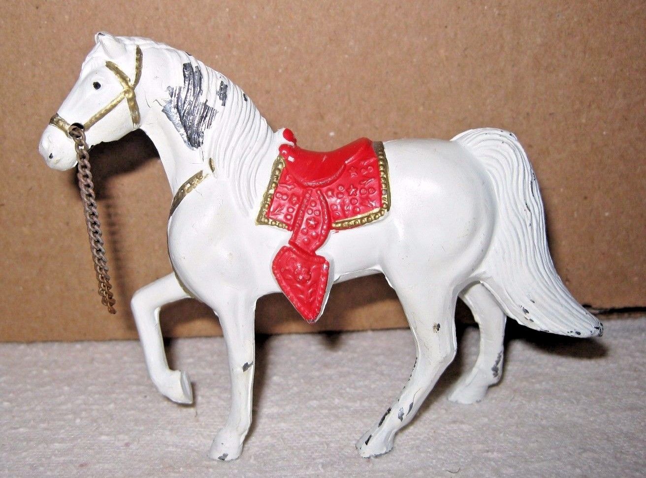 Title (ebay affiliate link): Vintage Small Painted Metal(?) Toy Horse From Japan, White with Red Saddle