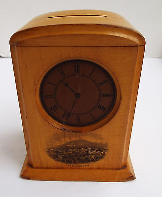 UNUSUAL ANTIQUE VICTORIAN c1880 MAUCHLINE TARTAN WARE MANTLE CLOCK MONEY BOX