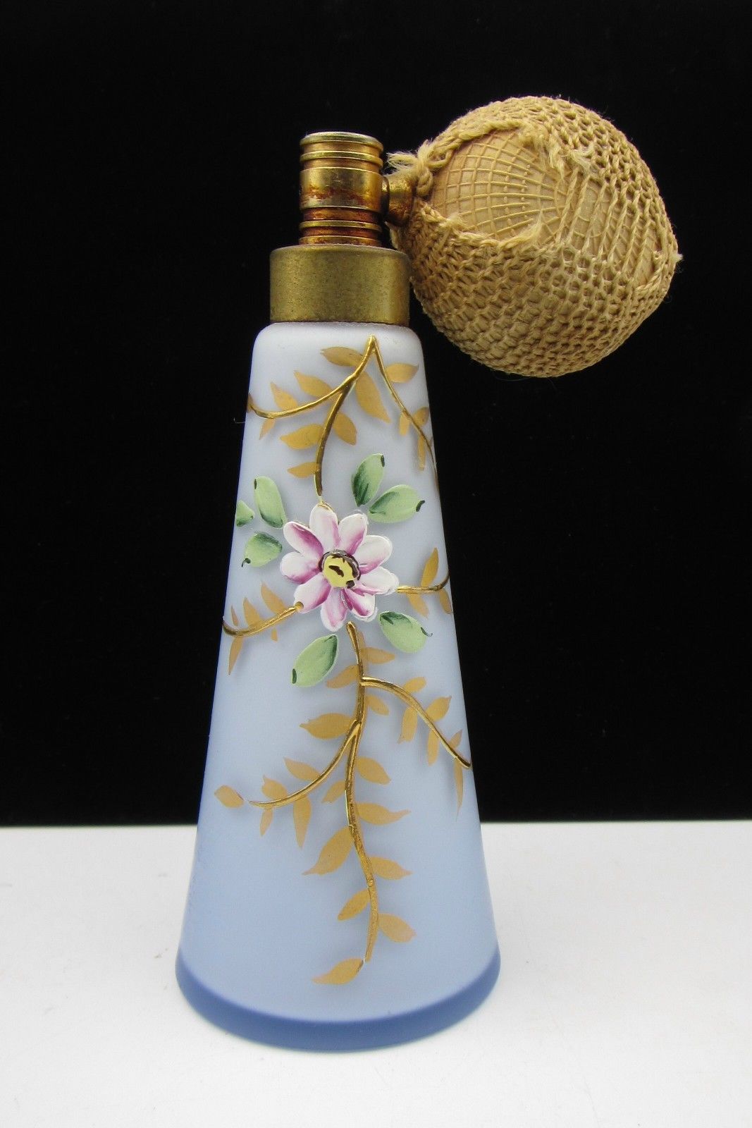 Title (ebay affiliate link): Vintage Cased Light Blue Frosted Glass & Enamel Flower Atomizer Perfume Bottle
