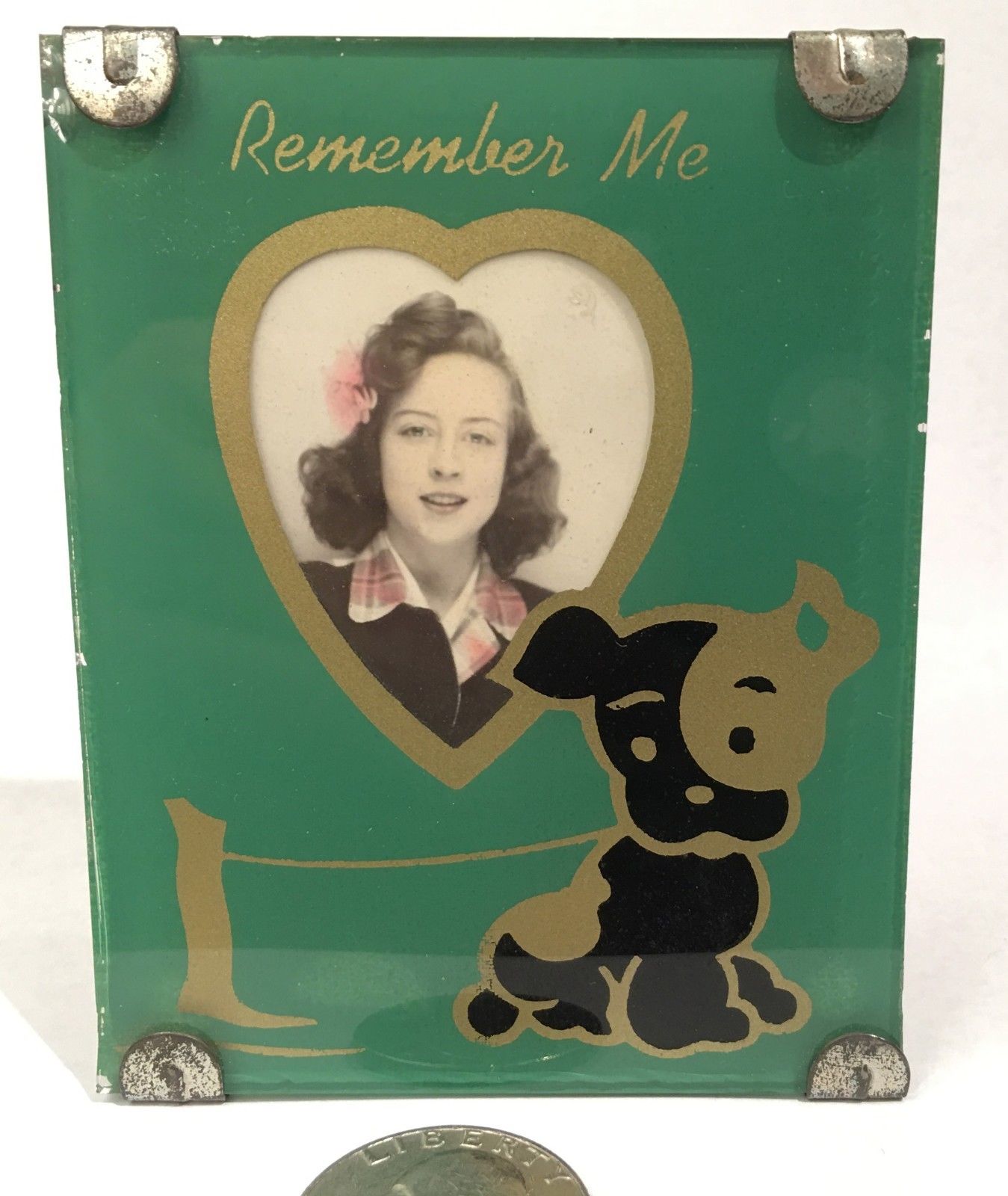 Title (ebay affiliate link): Vintage Glass Picture Frame Reverse Painted "REMEMBER ME" Cute Dog w Young Lady