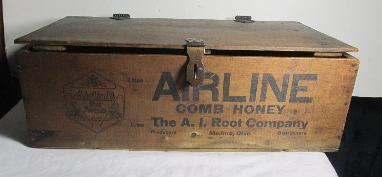 Early 1900''s advertising box AIRLINE Comb Honey Ohio crate box with lid NICE