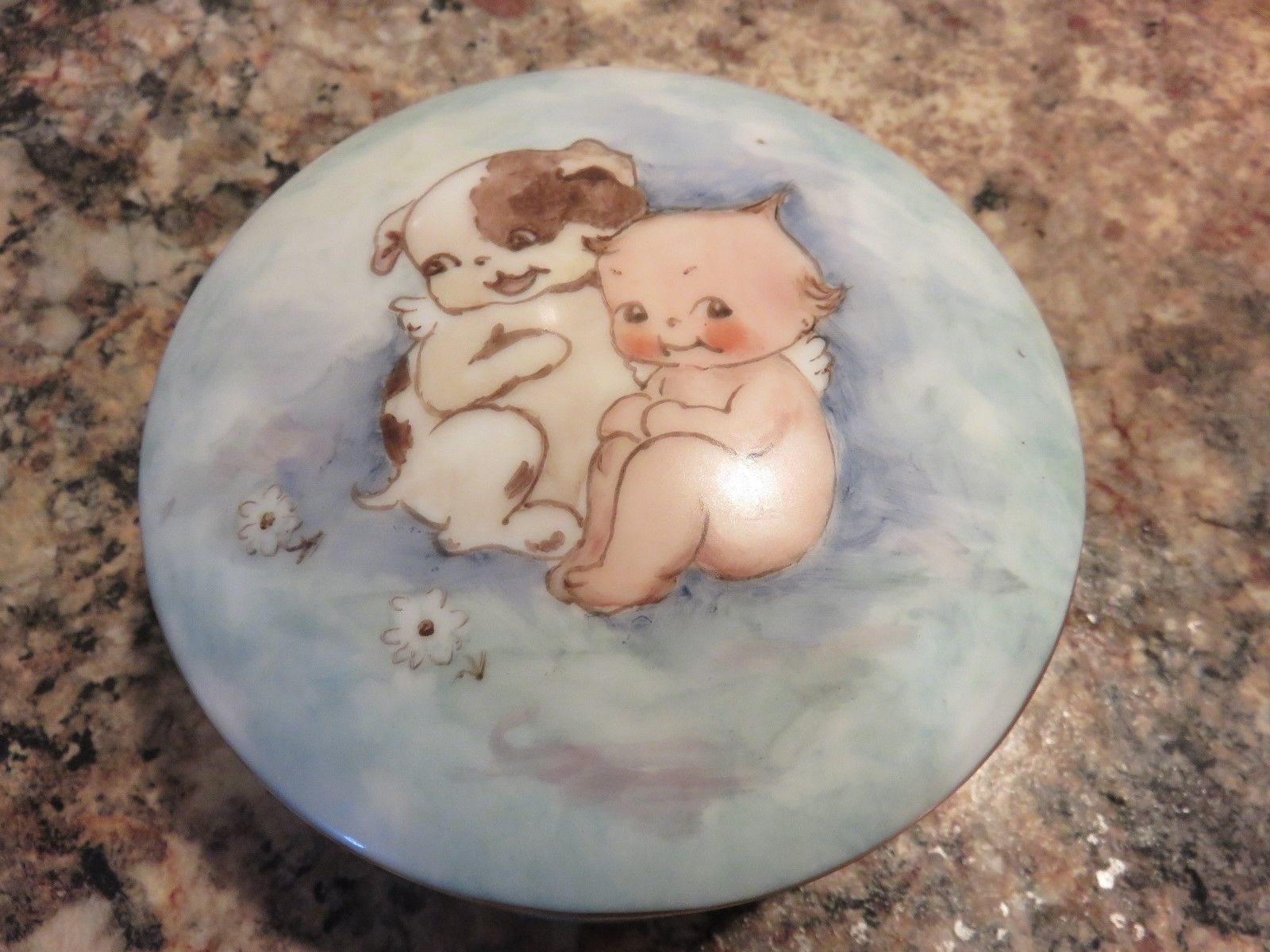 Title (ebay affiliate link): VINTAGE ROSE O''NEILL DESIGN HANDPAINTED KEWPIE & DOG POWDER TRINKET BOX SIGNED