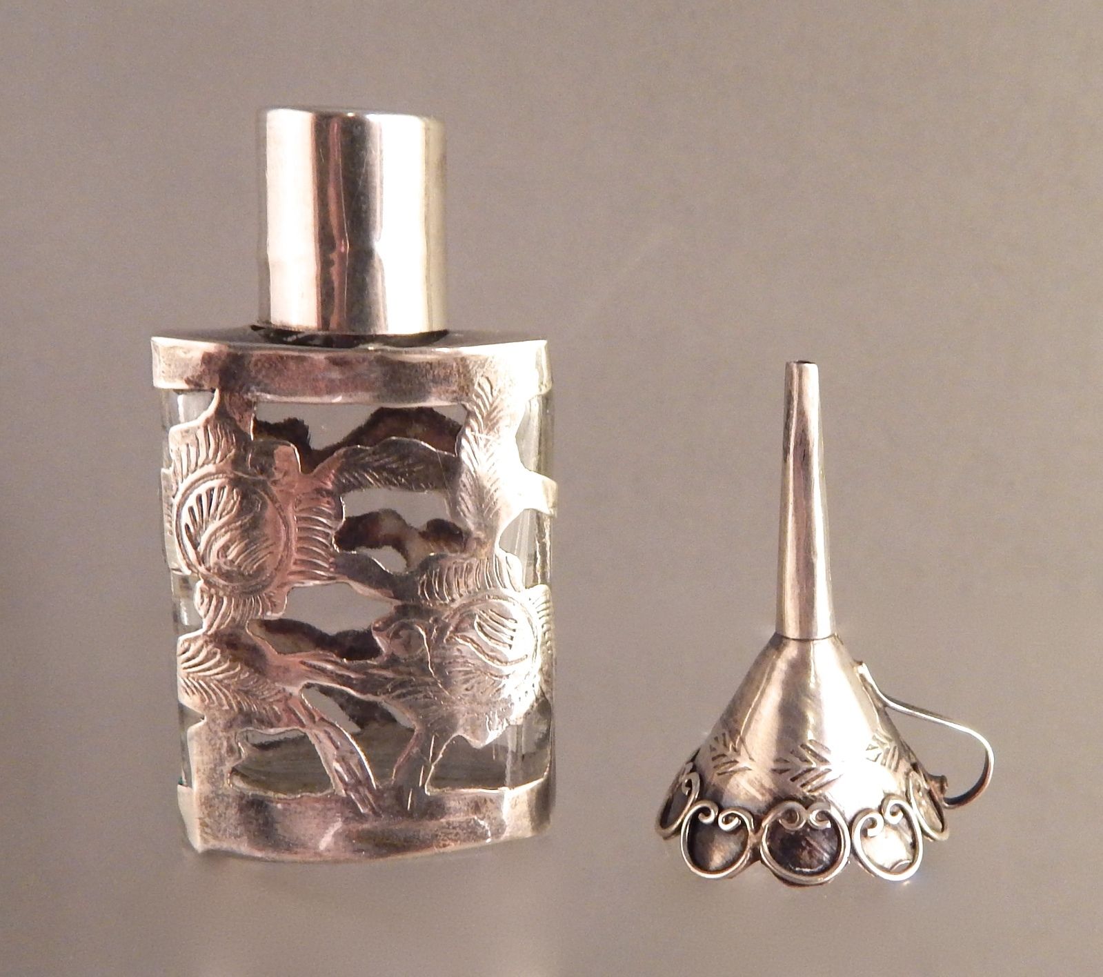 Title (ebay affiliate link): Vintage 925 Mexican Sterling Silver Overlay Glass Perfume Bottle & Funnel w/NR!