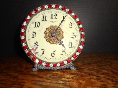 ANTIQUE/VINTAGE NEW HAVEN DRESSER CLOCK-PRONG SET RED AND CLEAR RHINESTONE NICE!