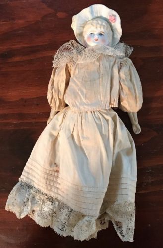 ANTIQUE BISQUE DOLL MOLDED BONNET & Old CLOTHES