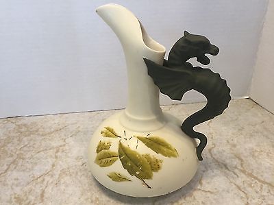 Unusual Antique Dragon Handled Hand Painted Ewer Pitcher White Green Leaves 8"