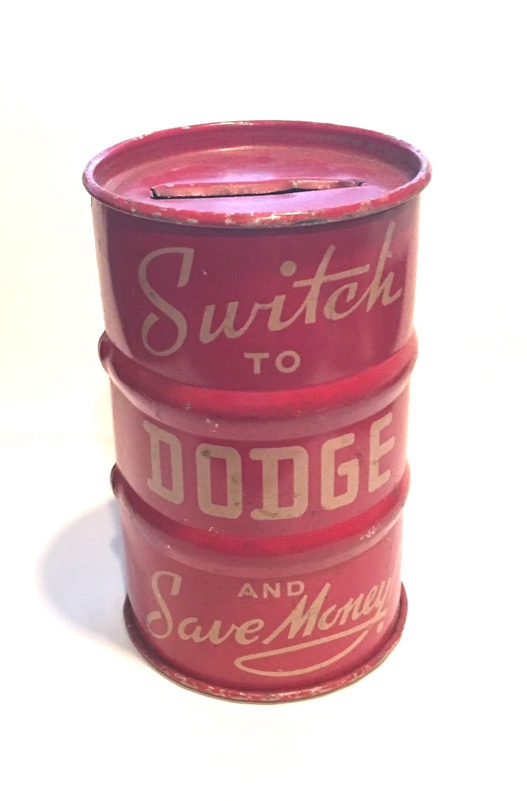 Title (ebay affiliate link): C. 1950s DODGE Auto Tin Gasoline Barrel Coin Bank Premium, Gas Station Giveaway