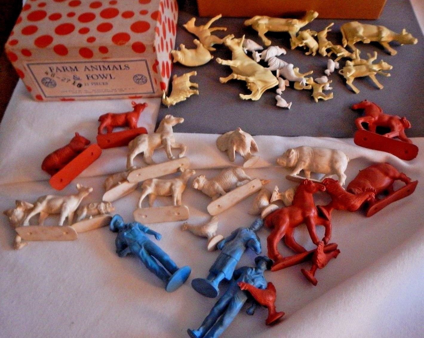 Vintage Marx Rubber Farm Animals Fowl Farmers 45 pcs plus a Marx Box