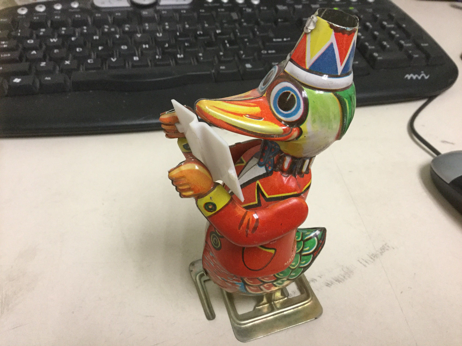 Title (ebay affiliate link): VINTAGE WINDUP TIN TOY DUCK READING A BOOK MISSING WINDUP KEY