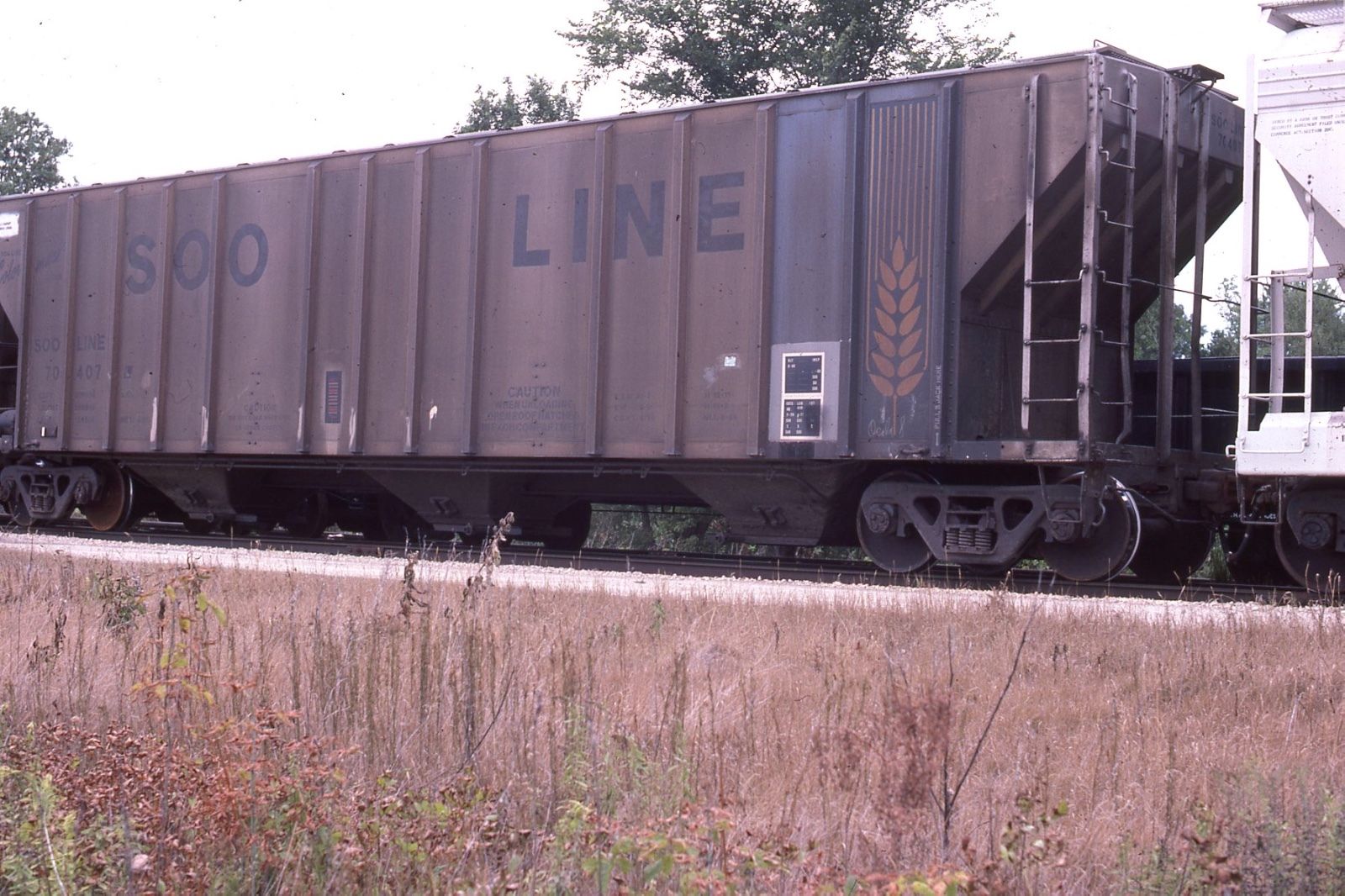 Title (ebay affiliate link): ORIGINAL KODACHROME SOO LINE COVERED HOPPER # 70407 HAMILTON WEST, ONT 1985