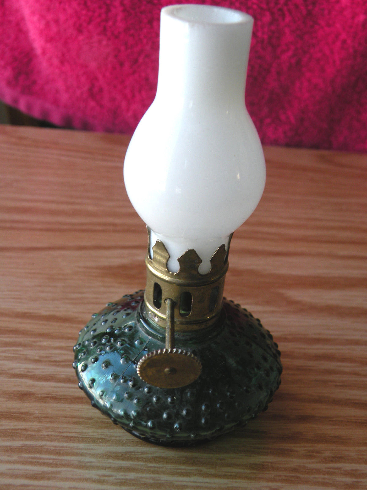 Title (ebay affiliate link): MINATURE (tiny 4") OIL- Kerosine LAMP, Green Hob Nail, Milk glass chimn HongKong