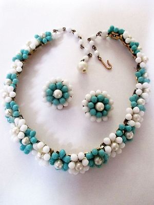 VINTAGE ESTATE 3 PC LOT AQUA WHITE MILK GLASS FLOWER BEAD NECKLACE EARRING SET