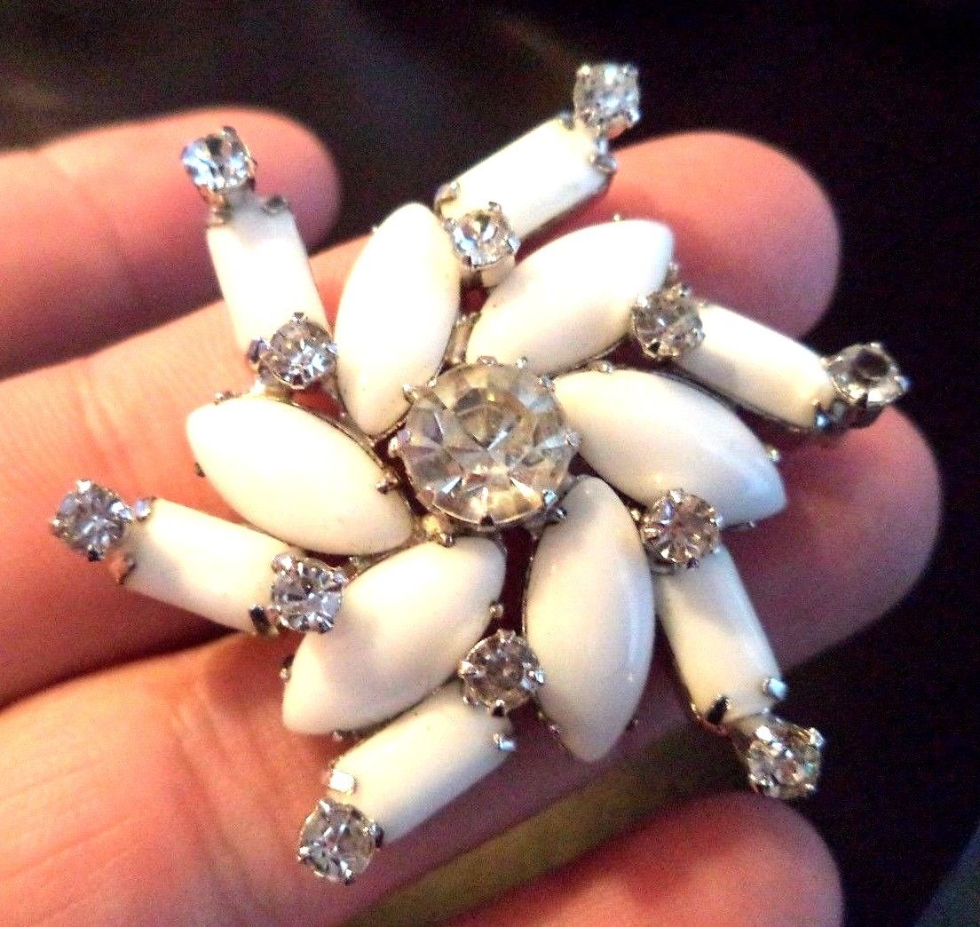 Title (ebay affiliate link): VINTAGE ESTATE HIGH END MILK GLASS RHINESTONE FLOWER 1 7/8" BROOCH!!! G3086