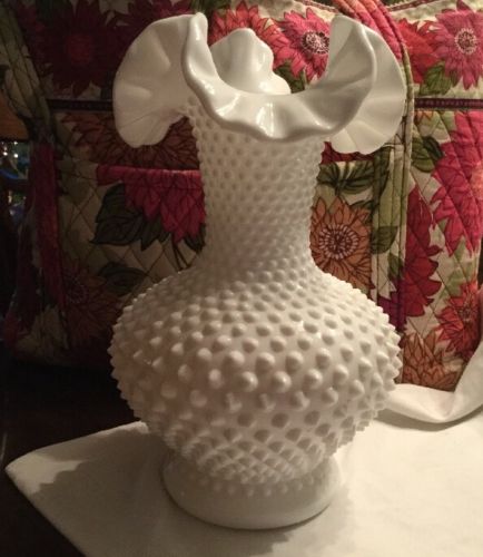Title (ebay affiliate link): tall milk glass ruffled vase hobnail design 10.5" at tallest spot