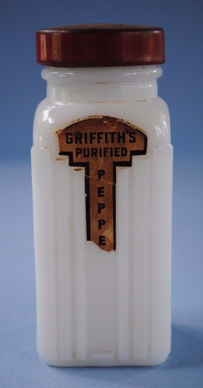 Vintage GRIFFITH''S PURIFIED PEPPER Milk Glass Spice Jar w/ Lid & Shaker