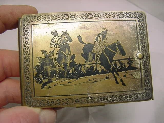 ANTIQUE HORSE & JOCKEY CARD CASE BLACK LACQUER BRASS ORNATE BLACK MEMORABILIA