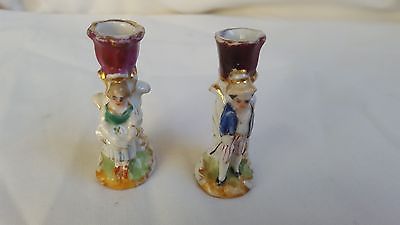 RARE ANTIQUE XIX PAIR PORCELAIN SMALL CANDLESTICKS W/ FIGURES