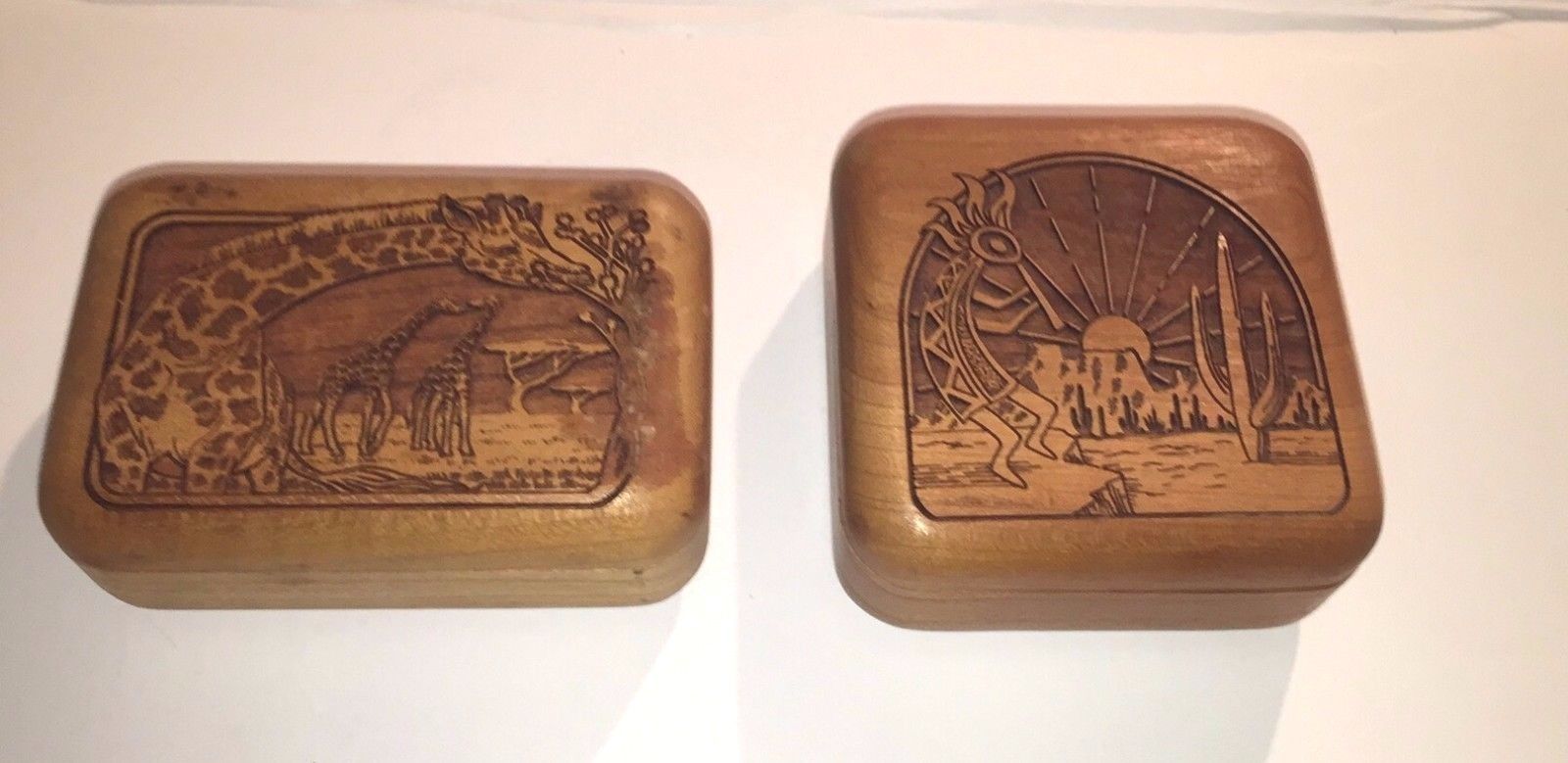 LOT 2 VINTAGE CARVED WOOD TRINKET BOXES GIRAFFE + DESERT SCENES MAGNETIC SLIDE