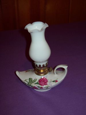 MINIATURE OIL LAMP ROSE PATTERN MILKGLASS SHADE