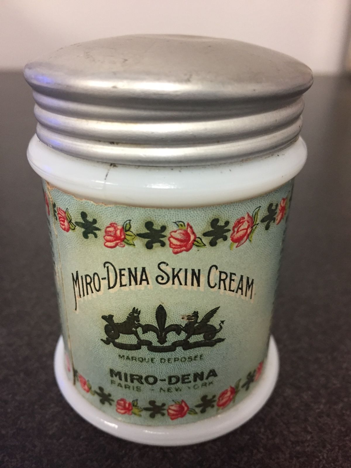 Title (ebay affiliate link): VINTAGE "MIRO-DENA" SKIN CREAM MILK GLASS JAR; PARIS, NEW YORK