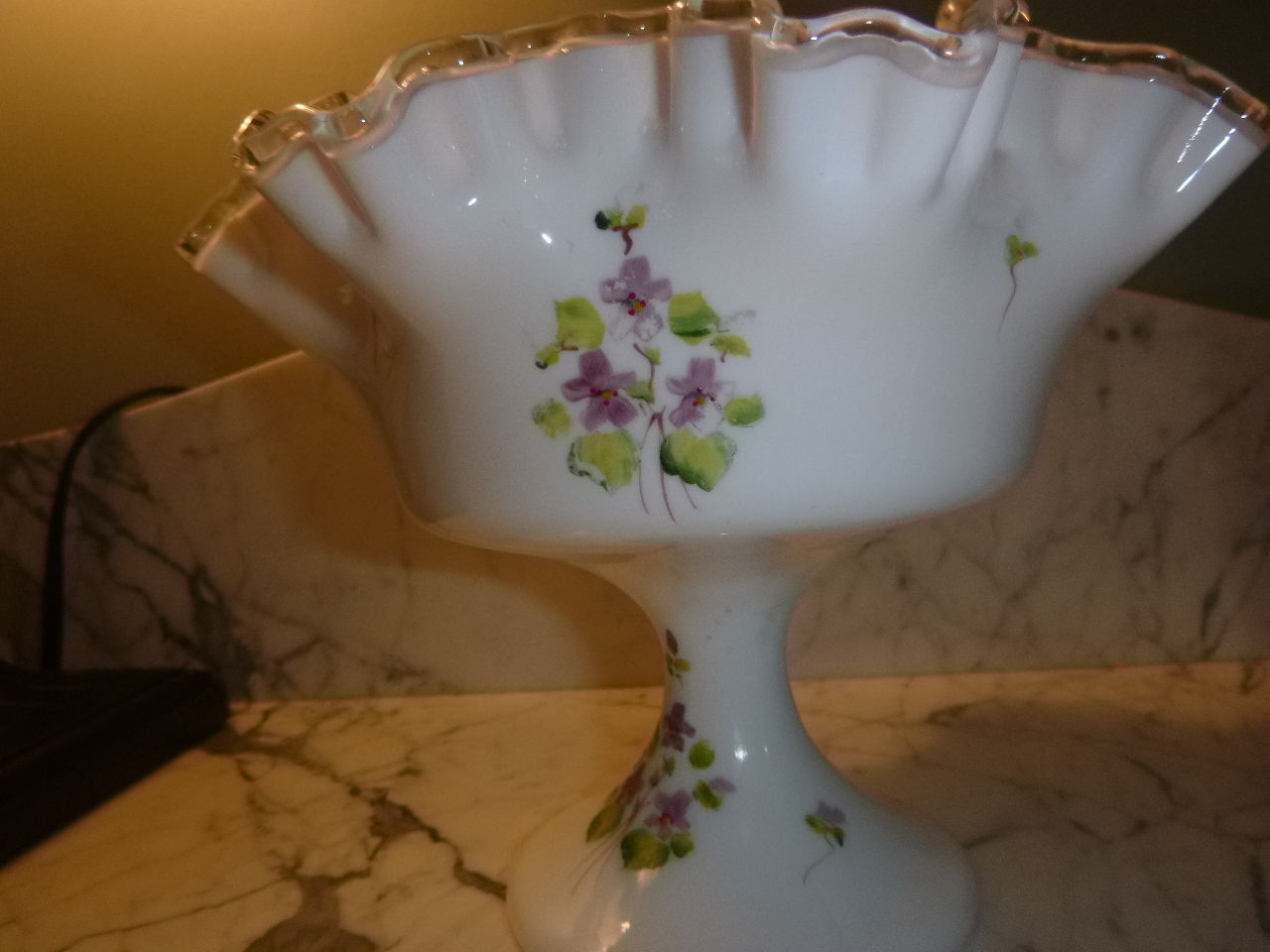 Title (ebay affiliate link): Fenton Milk Glass Silver Crest Violets In The Snow Large Footed Compote Bowl