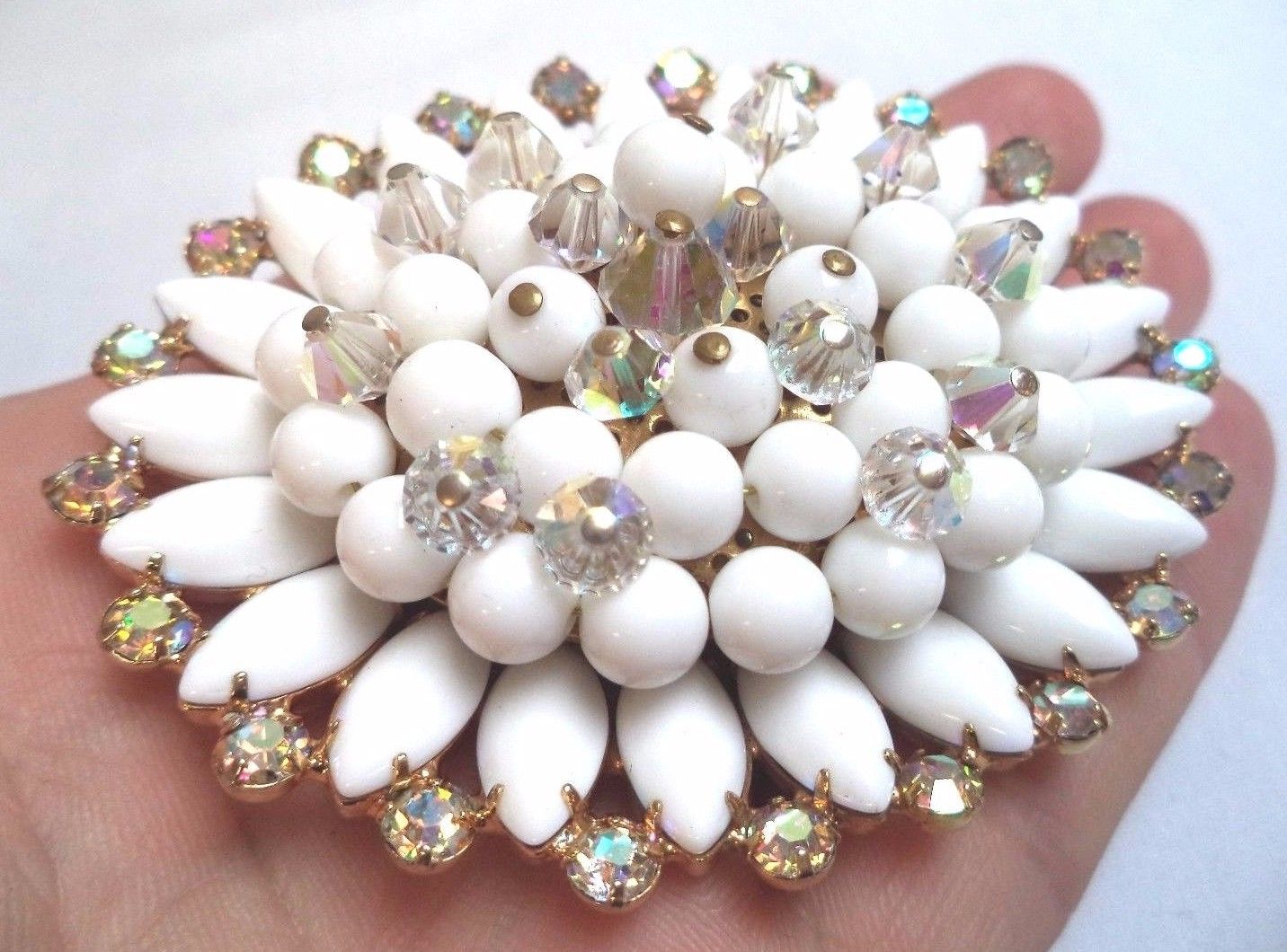 Title (ebay affiliate link): STUNNING VINTAGE HIGH END MILK GLASS AB RHINESTONE FLOWER 3" BROOCH MINTY! G3254
