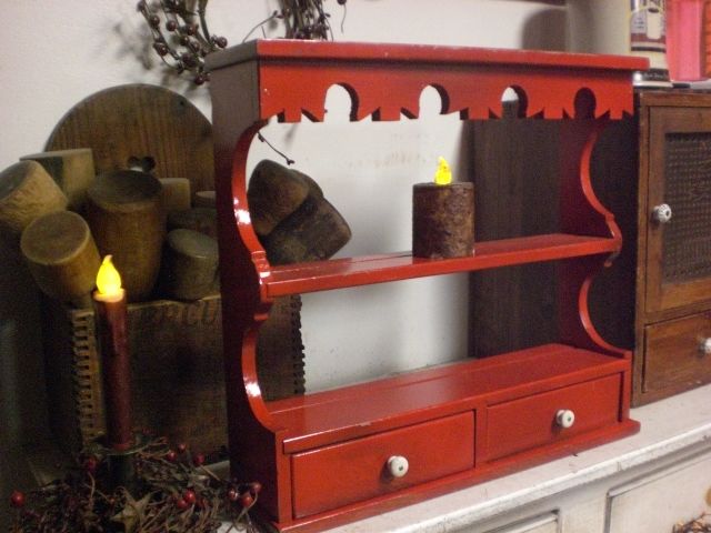 Title (ebay affiliate link): Primitive Wooden Old Spice Rack w/ Drawers ~ Wood Shelf ~ Red
