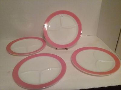 Vintage Set of 4 Pyrex Corning Milk Glass Divided Dinner Plates Pink Band 9 3/8"