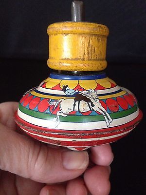 Vintage Tin Litho Spring Action Spinning Toy Top Cowboy, Bucking Bronco, Rodeo