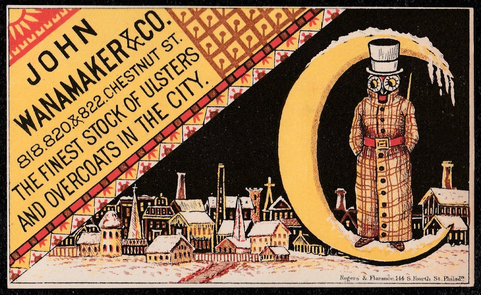 VICTORIAN TRADE CARD JOHN WANAMAKER & CO. PHILADELPHIA OWL IN MOON