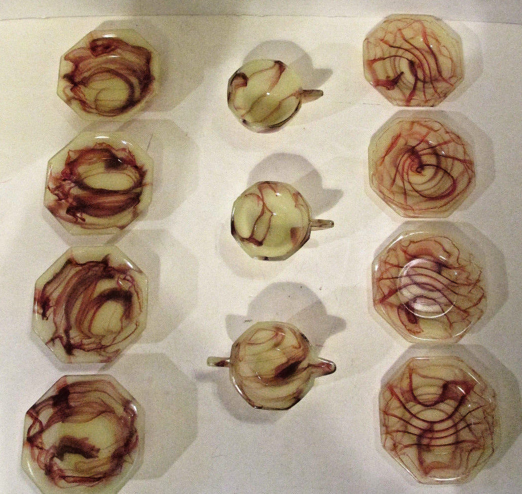 Title (ebay affiliate link): Oxblood and Lemonade Glass, Akro Agate, Closed Handle, 11 Pcs. Child''s Tea Set