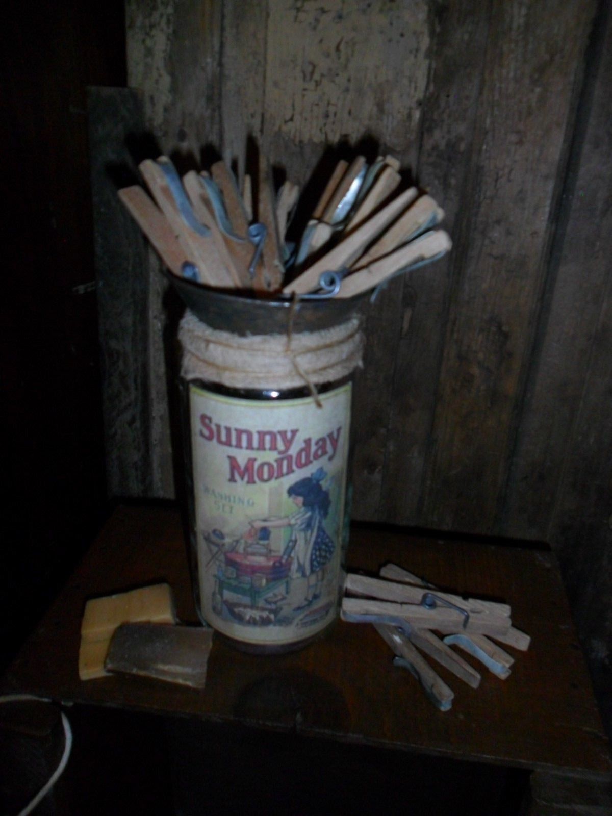 Primitive Old Cloth Pins, Early Look Farmhouse Jar, Old Funnel, Wash Room Soap
