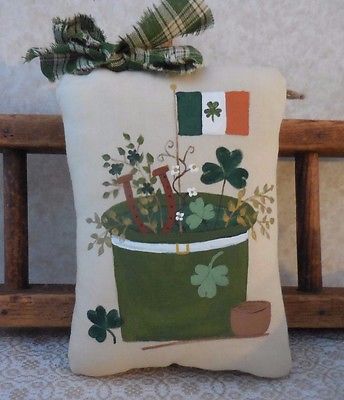 Title (ebay affiliate link): Primitive St Patricks Day Gathering Pillow Leprechaun Hat Painted Wallhanging