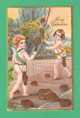 VINTAGE VALENTINE''S DAY POSTCARD CUPIDS PLAY TENNIS WITH HEARTS! NET COURT