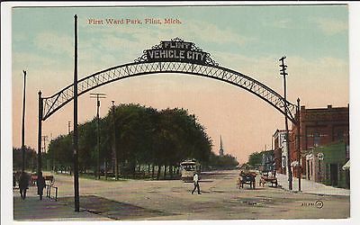 Title (ebay affiliate link): Flint MI First Ward Park Arch Vehicle City Trolley Street Scene Vintage Postcard