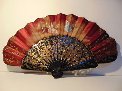 ANTIQUE HAND PAINTED & HAND CARVED GOLD & BLACK LACQUERED WOOD FAN
