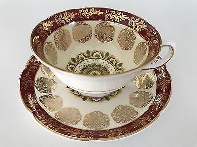 ROYAL GRAFTON Maroon CUP SAUCER GOLD OVERLAY BONE CHINA c. 1957-61 ELEGANT RARE!