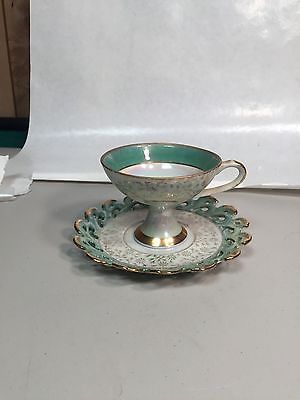 Vintage Green, gold and White Pedestal Tea Cup and Saucer