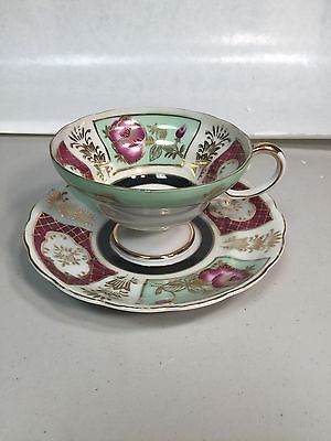 Vintage Hand Painted Tea Cup and Saucer Lime Green Gold and Purple Floral