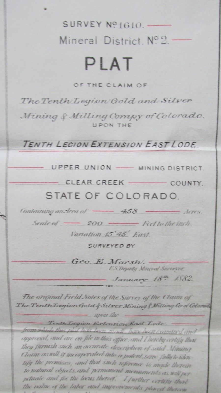 Original 1882 Mine Claim Plat-10th Legion Extension E. Lode-Clear Creek Colorado