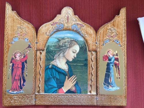 Title (ebay affiliate link): VINTAGE FLORENTINE GILT WOOD TRIPTYCH MADONNA & ANGELS 10"x12" SCREEN